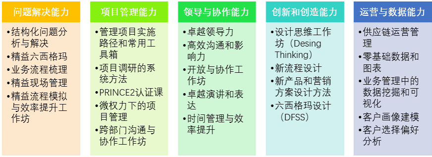 优秀的人才和卓越领导能力是透过系统的学习方式与具体实践方法逐步成型,是每天发展累积的成果,而非一蹴而就。因此各层级领导人的能力,需要以循序渐进方式进行有系统的培育与发展,才能获得显着成效。领导力培养不是一个单独的课程,而是针对基层,中层和高层经理的发展,围绕各种能力培养建立起来的一系列主题课程,课程目标是培养五个方面的能力:问题分析和解决能力、项目实施和管理能力、领导与协作能力、创新与创造能力、运营与数据分析能力。